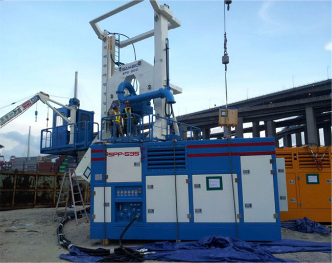 講座最后,景安重工董事長(zhǎng)陳衛(wèi)先生對(duì)景安JRD(氣舉反循環(huán))鉆機(jī)及其聯(lián)合全回轉(zhuǎn)施工工藝進(jìn)行了詳細(xì)介紹與講解。他指出,JRD反循環(huán)鉆機(jī)是一套以全液壓控制的嵌巖鉆機(jī),利用液壓旋轉(zhuǎn)動(dòng)力頭提供足夠的扭矩及旋轉(zhuǎn)速度,再加上鉆具自重及加壓液壓油缸的下壓力,通過鉆頭上滾刀對(duì)巖面進(jìn)行位移與壓破,從而達(dá)到嵌巖的效果。該鉆機(jī)及相關(guān)工法已在福建、香港、澳門等地區(qū)的重點(diǎn)工程中“大顯身手”,為復(fù)雜地層的嵌巖施工提供了極佳的方案,獲得合作方一致好評(píng)。