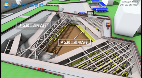 運用BIM模型模擬土石方開挖,明確土方開挖順序以及開挖過程中的出土方向。白鵝潭國際金融中心項目土方豎向開挖依據(jù)支撐標高分為4個施工層段,均由基坑非支撐影響區(qū)中心在原開挖面采用后退式開挖。